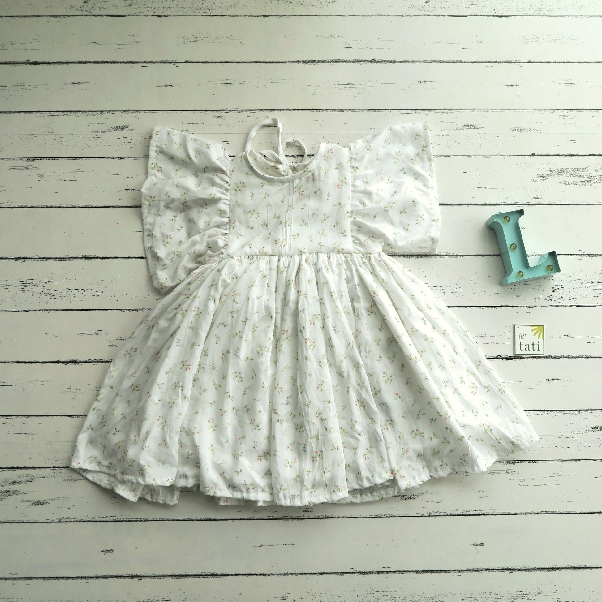 This charming Petal dress features flowy sleeves, a fitted bodice, and a high round neckline with a delicate back tie. The full gathered skirt adds volume and movement, making it perfect for twirling and special moments.