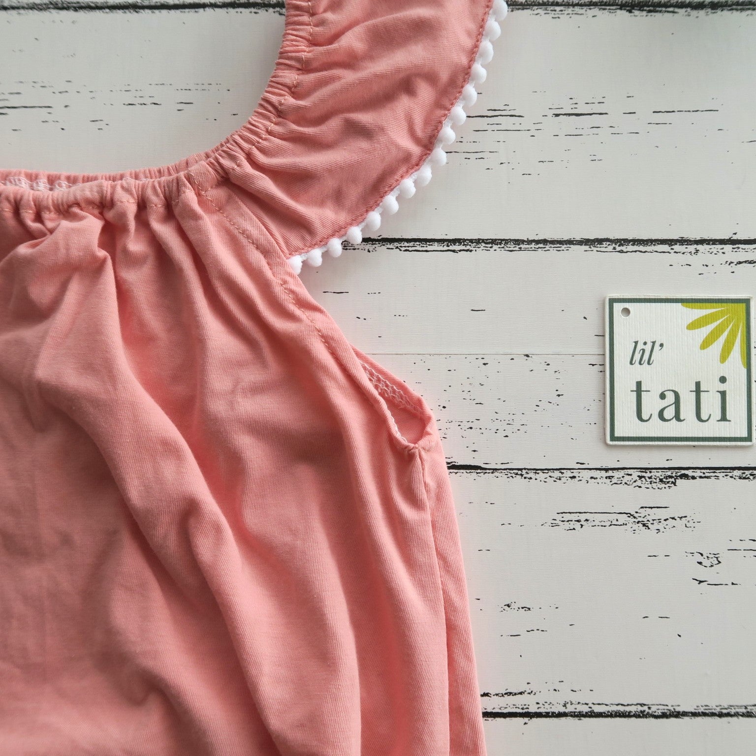 Playsuit with pompoms and bottom snaps.